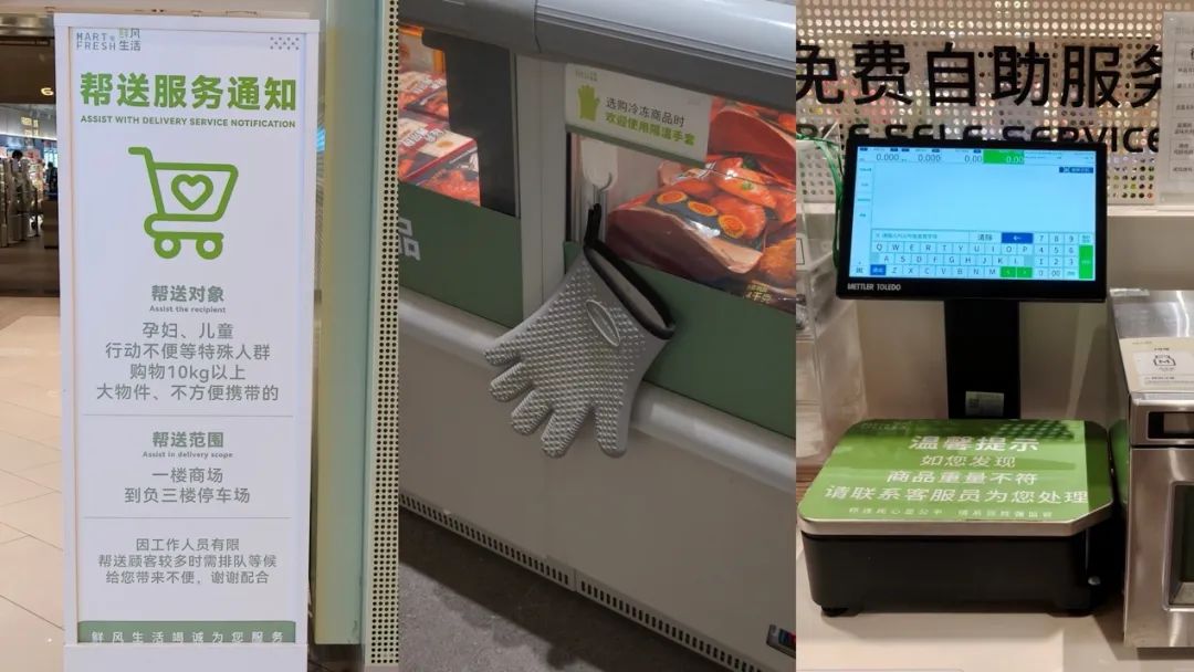 進(jìn)門前,鮮風(fēng)生活用立牌鮮明的提示顧客:可以為孕婦及行動(dòng)不便者提供幫送服務(wù);店內(nèi),冷凍柜旁放著防凍傷的保溫手套、冷凍柜上還有可以隨意取用的保溫袋;結(jié)賬處不僅有可以用來(lái)復(fù)稱的稱重臺(tái),還有取冰機(jī)、微波爐、復(fù)印機(jī)等自助方便設(shè)施;服務(wù)臺(tái)前還提供可隨意取用填寫(xiě)的顧客反饋表……