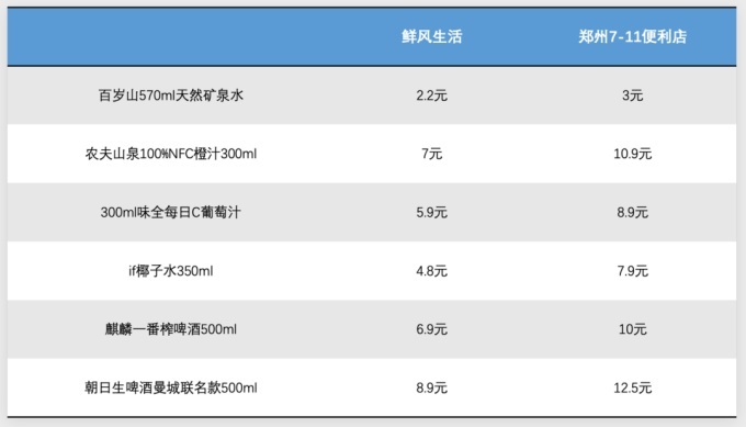 圖:鮮風(fēng)生活與7-11便利店部分商品的價(jià)格對(duì)比