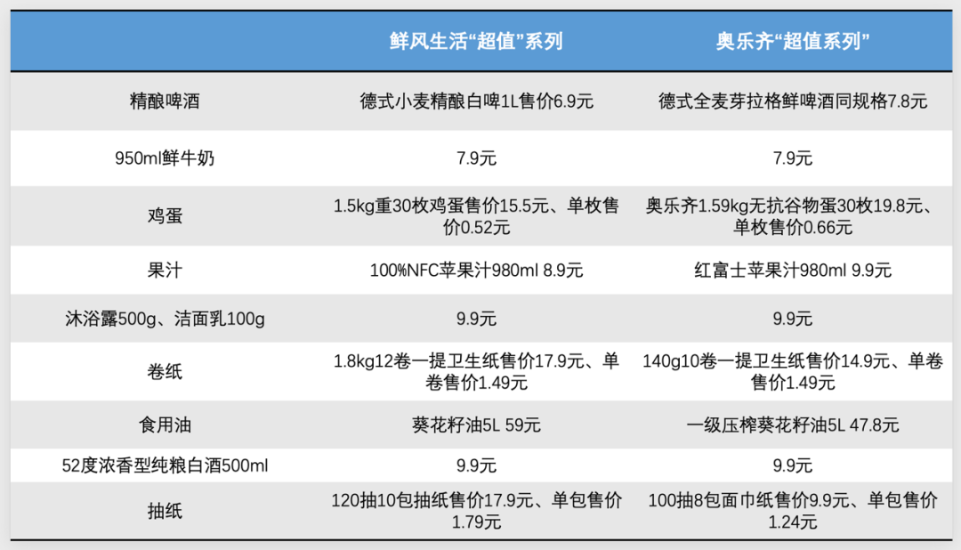 圖:鮮風(fēng)“超值”系列與奧樂(lè)齊“超值”系列部分商品的價(jià)格對(duì)比