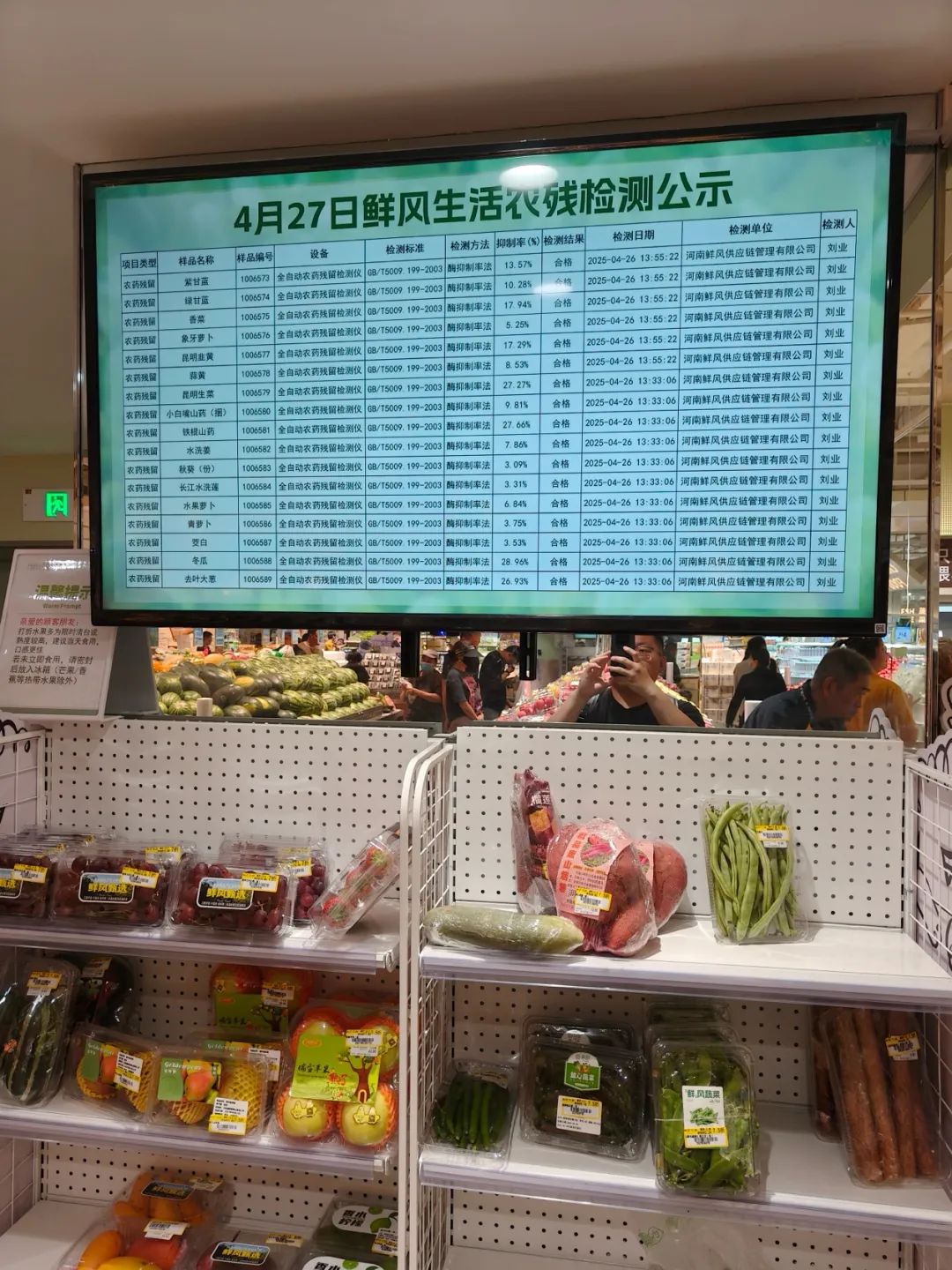 圖:鮮風(fēng)生活在店內(nèi)公示蔬菜農(nóng)殘數(shù)據(jù)